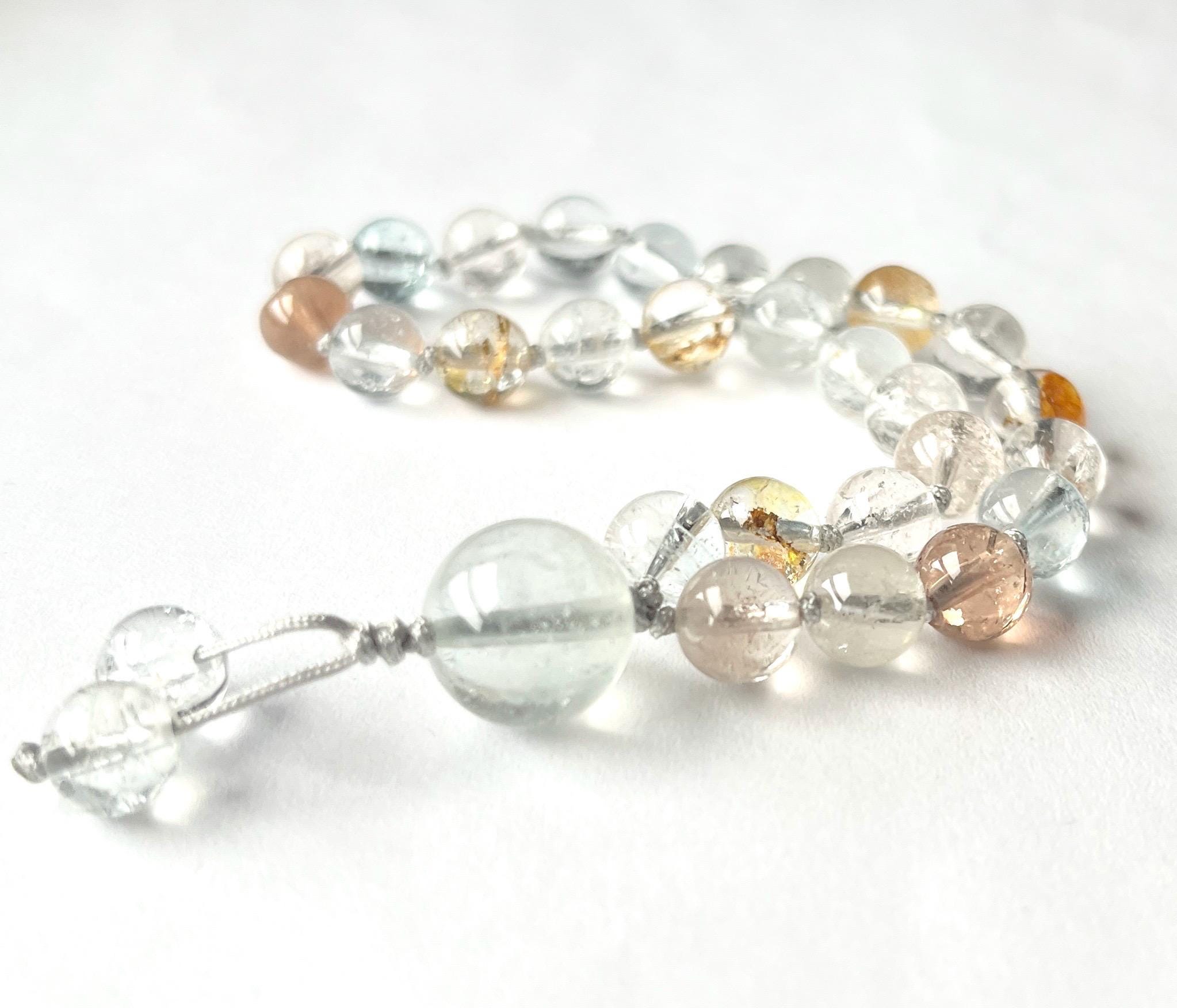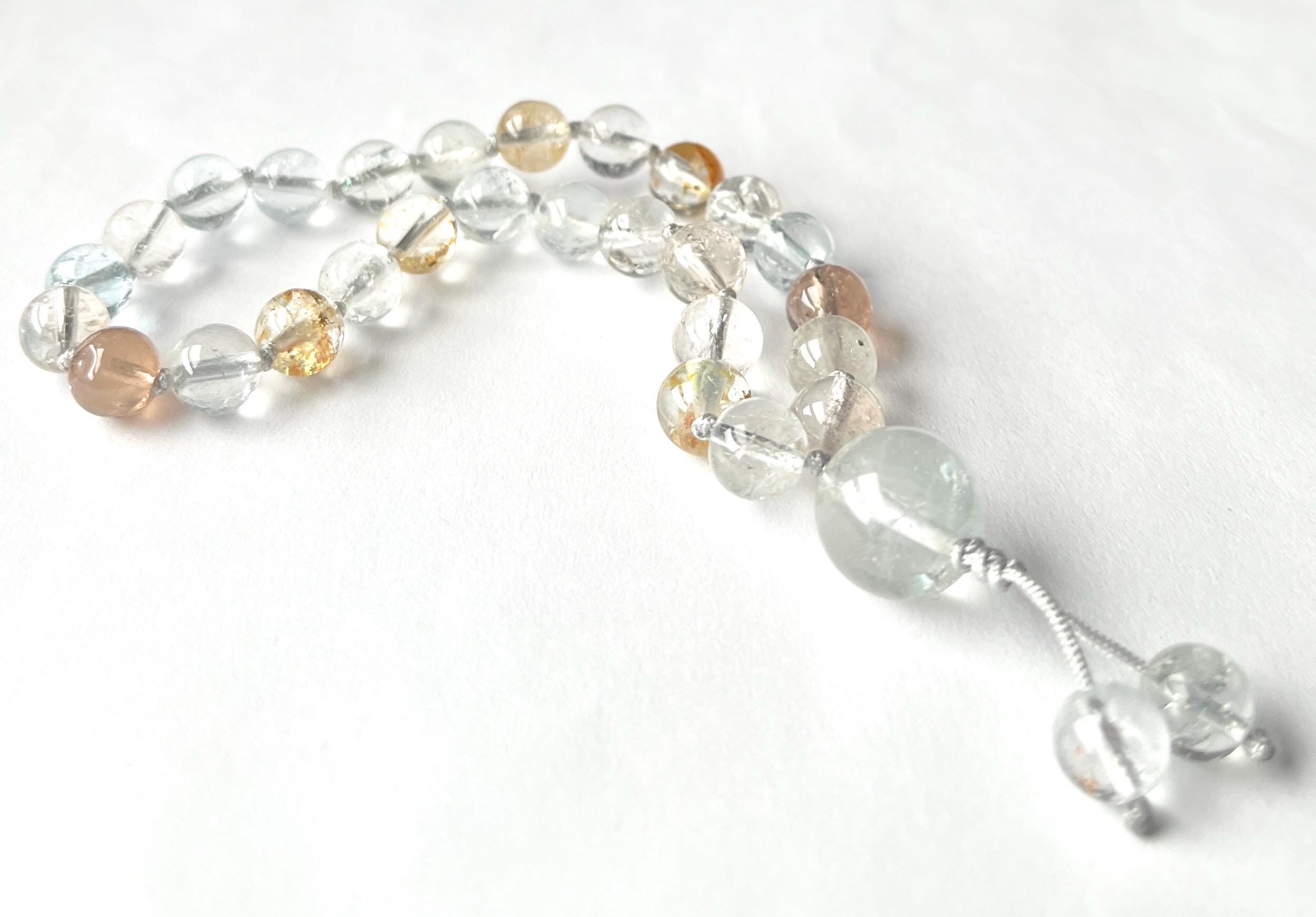 This unique mala is made out of 27/7.5-8mm AAA Multi Color Topaz smooth round beads, 12.8mm Topaz guru, Topaz beaded tassel, nylon beading cord hand knotted between each bead.