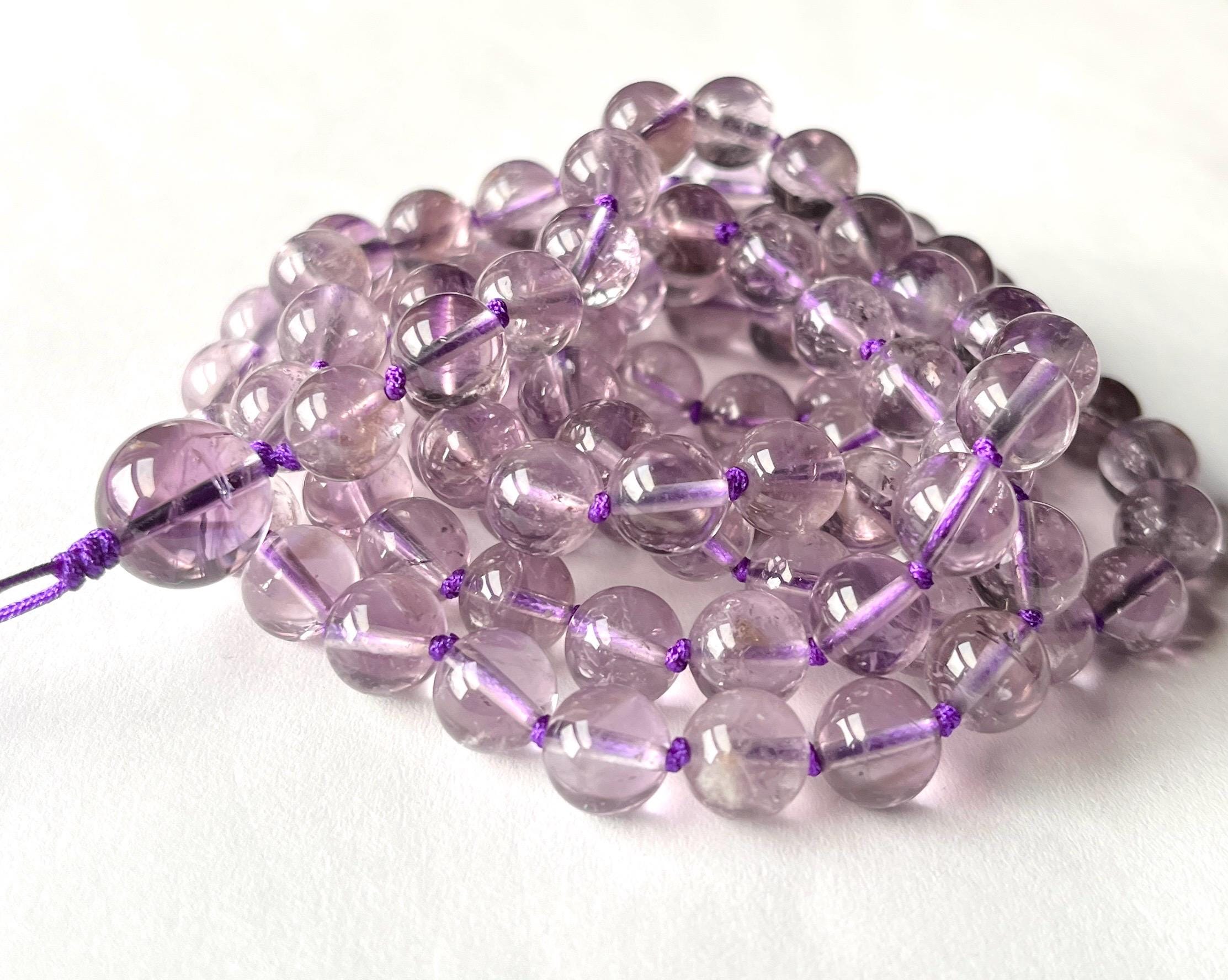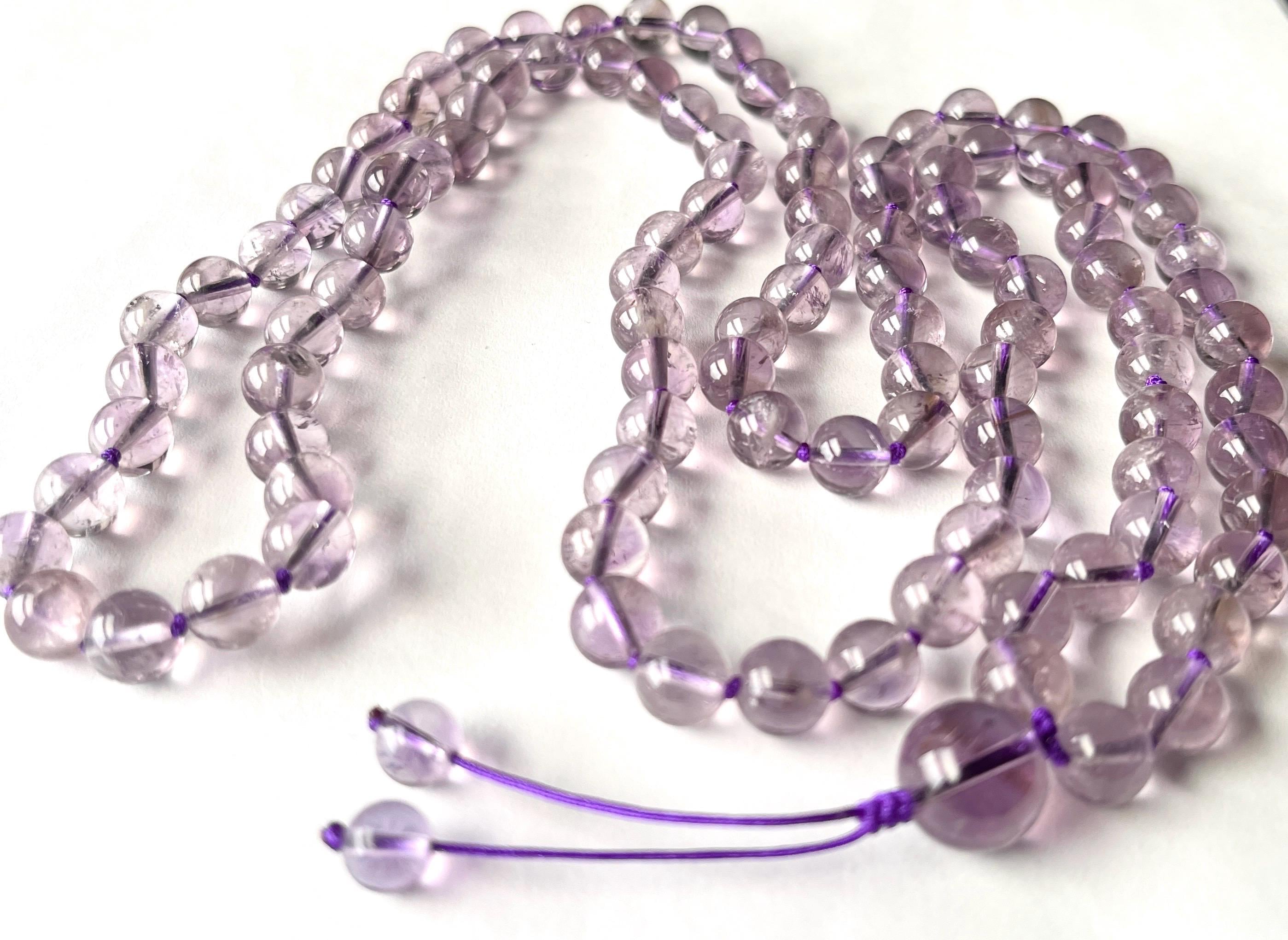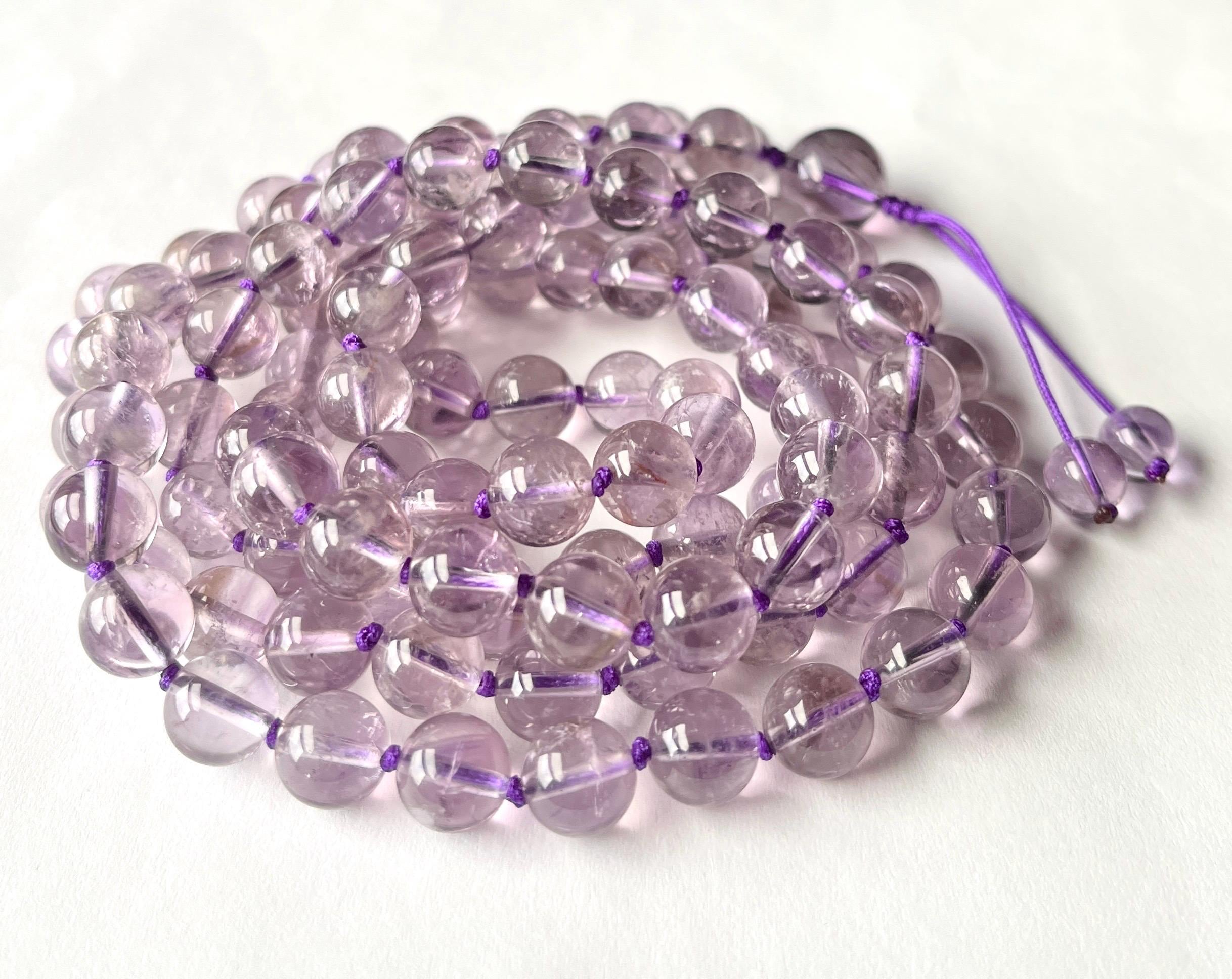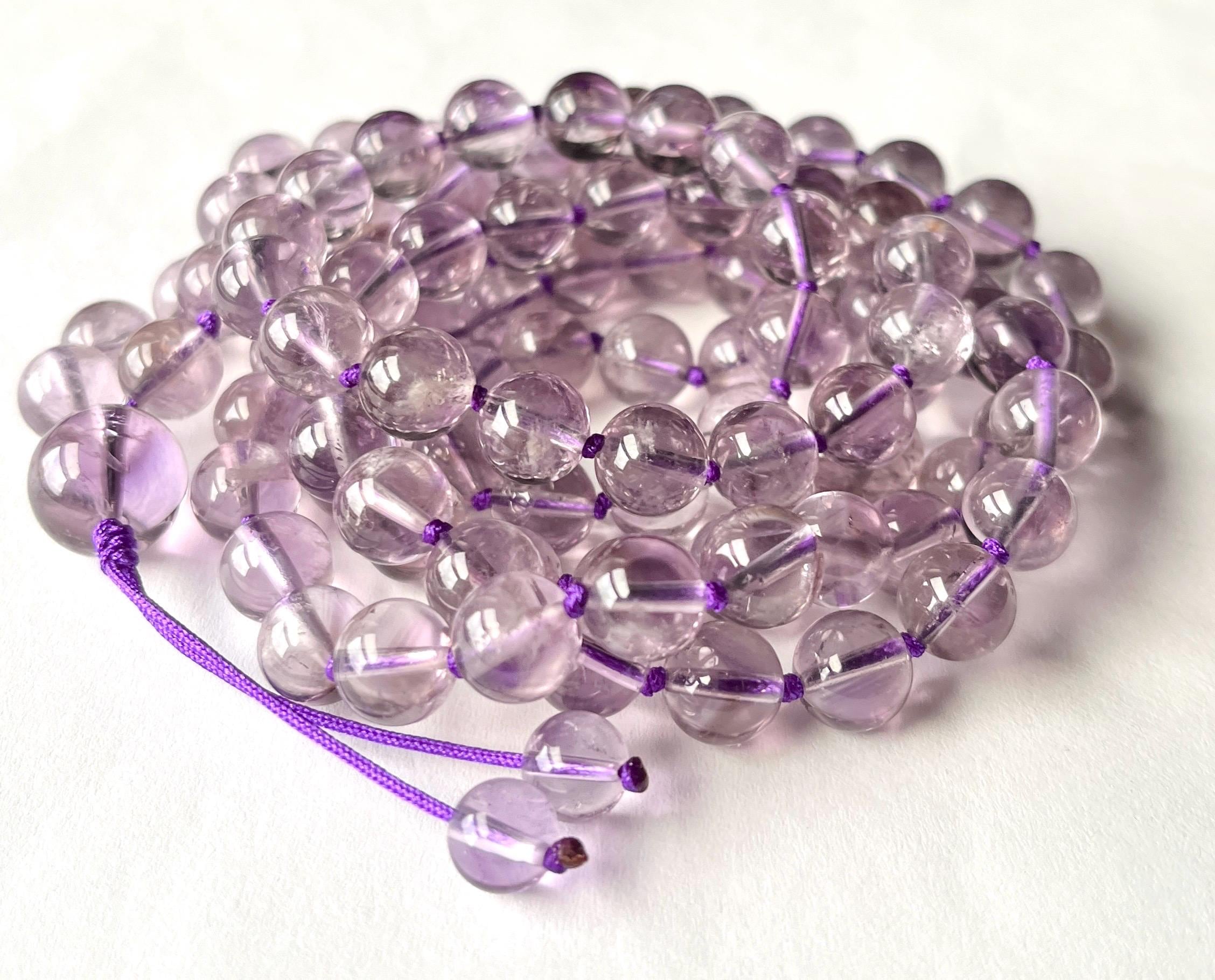 Regular cleansing of your semiprecious stone mala is recommended. Gemstones absorb negative energy well and could also transmit the negativity back if they become saturated. To remove any unwanted energy, leave your mala in moon or sunlight, let it rest under a tree, using sound vibration to clear your crystals such as religion or meditation music.