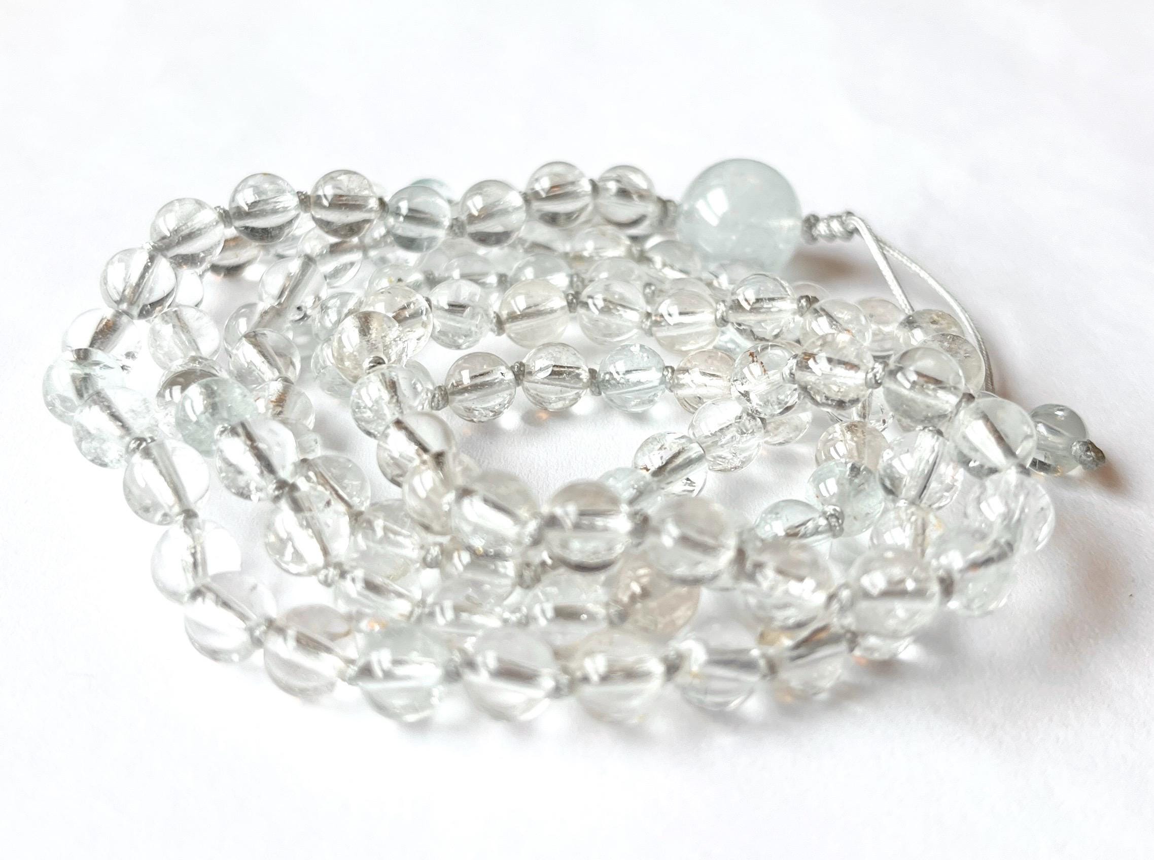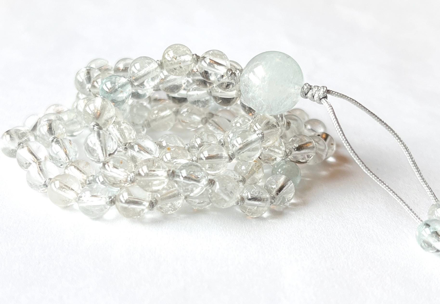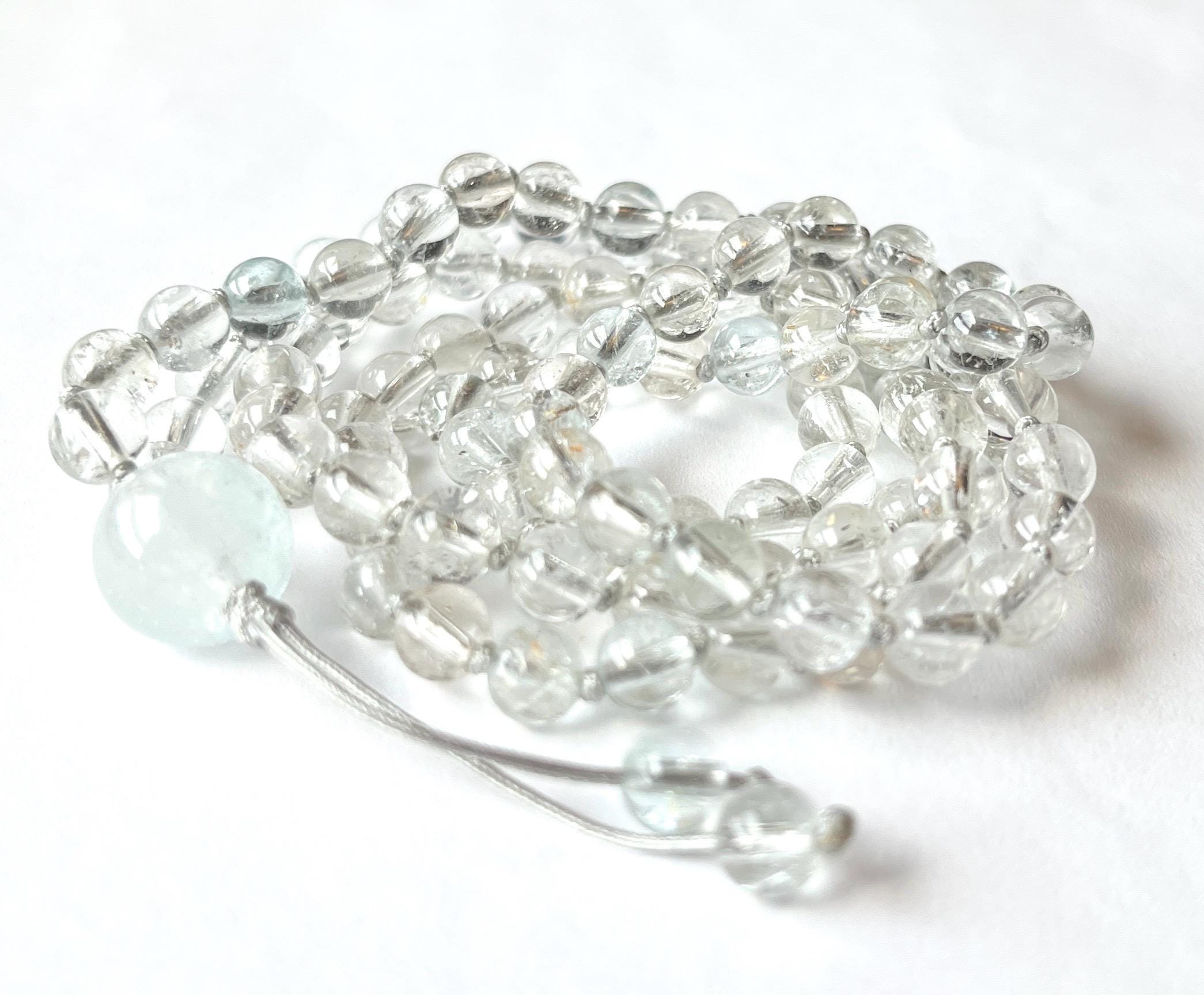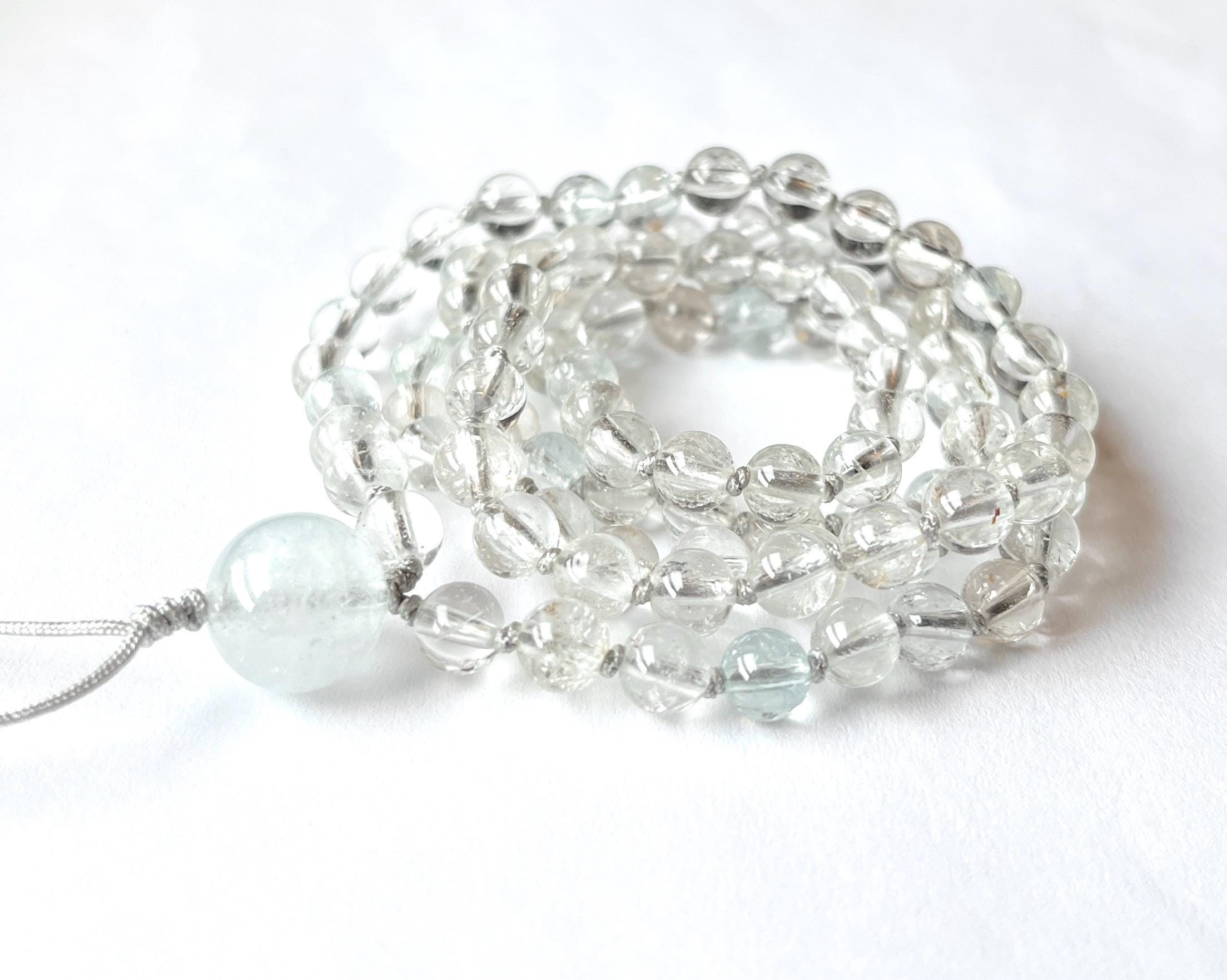 This unique mala is made out of 108/6mm AAA Topaz smooth round beads, there are few aqua blue and pale yellow beads mixed with clear. White Topaz guru, nylon beading cord hand knotted between each bead.
