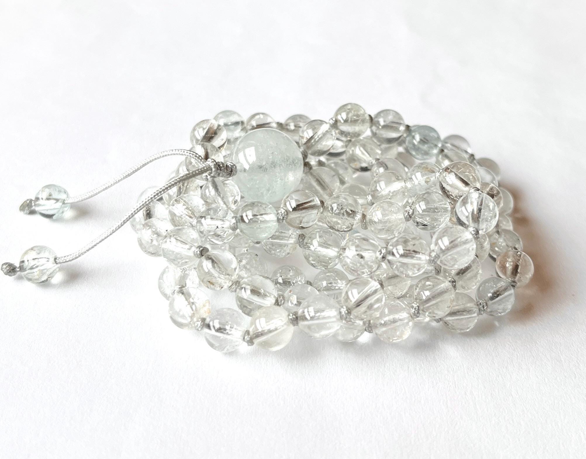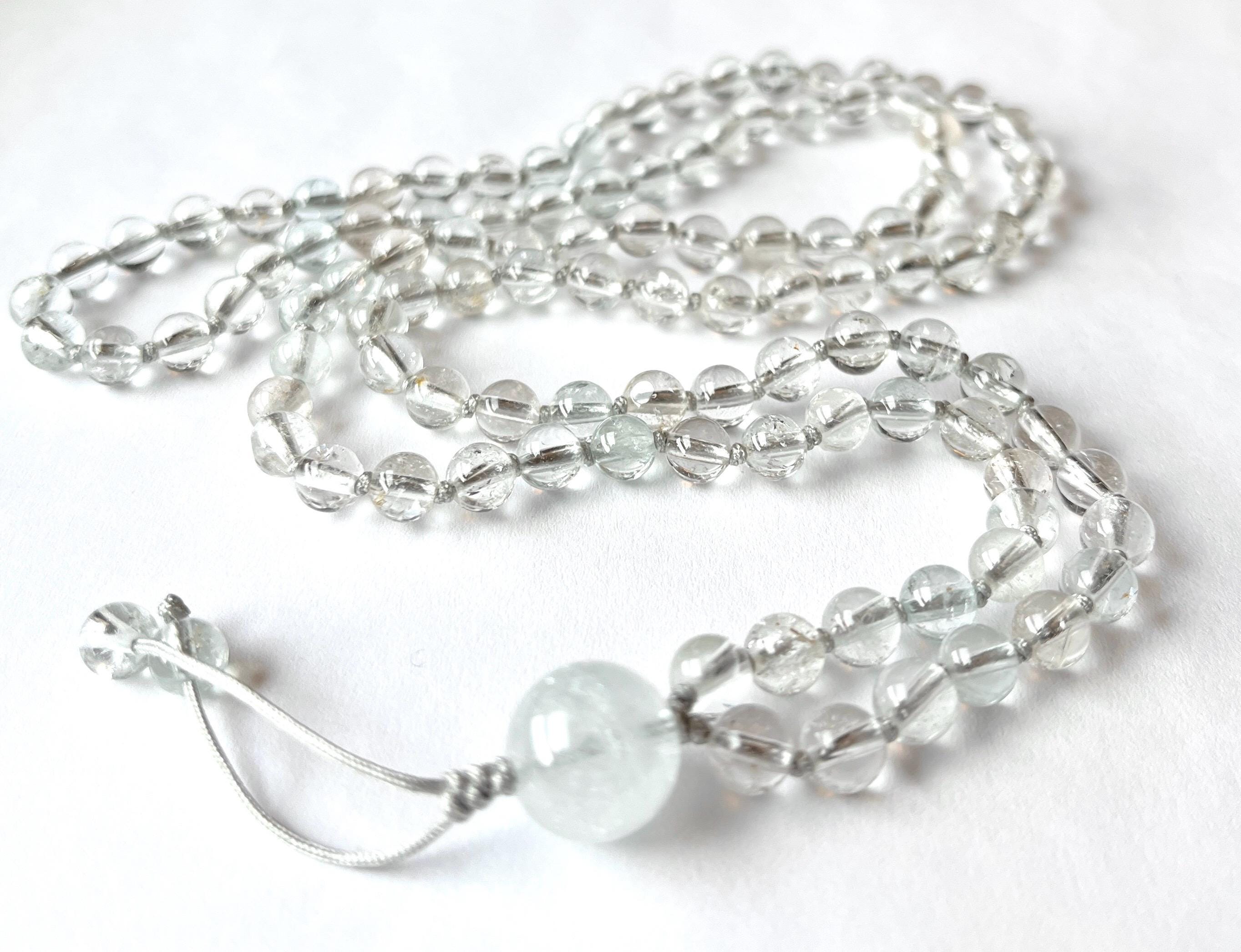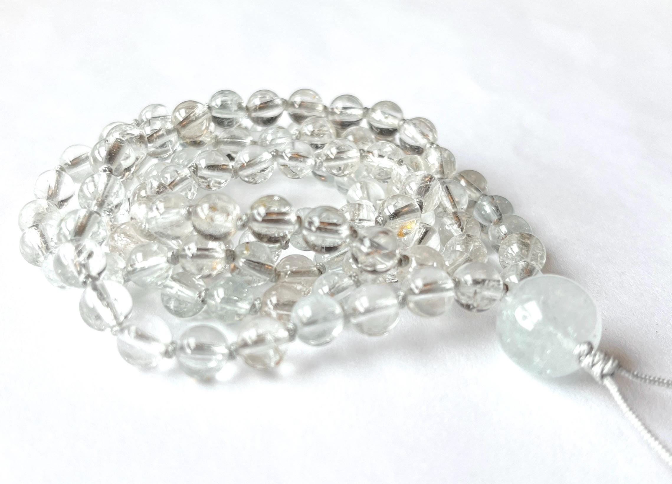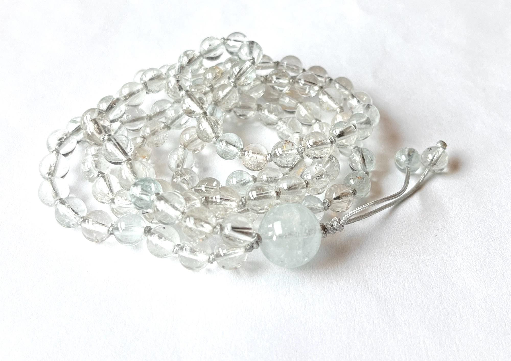 This unique mala is made out of 108/6mm AAA Topaz smooth round beads, there are few aqua blue and pale yellow beads mixed with clear. White Topaz guru, nylon beading cord hand knotted between each bead.