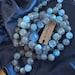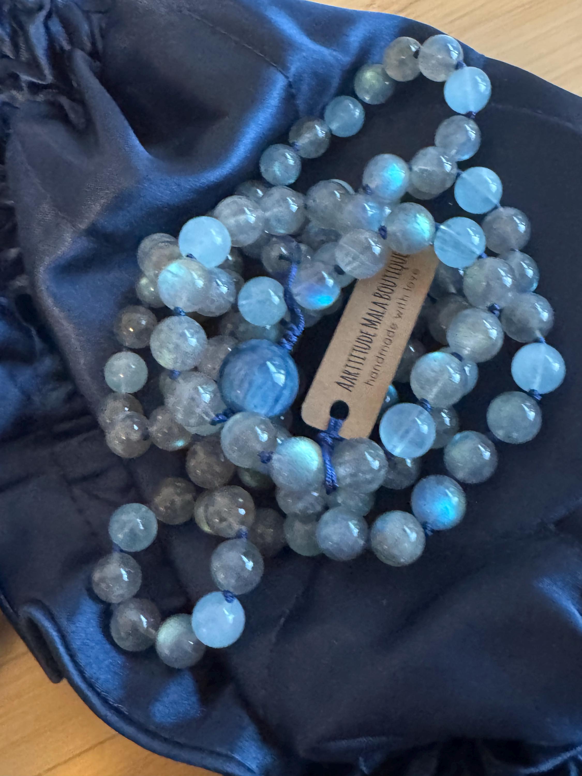 This 108 beads mala is beautiful to behold and a dream to handle. Beads are made of flashing labradorite and translucent aquamarine stones and each hand tied knot in between the beads is of consistent size. The mala was well packaged to prevent damage during shipping and arrived quickly after purchasing.