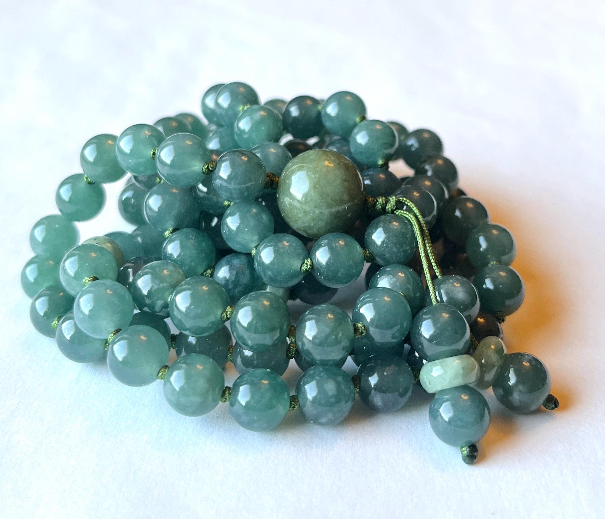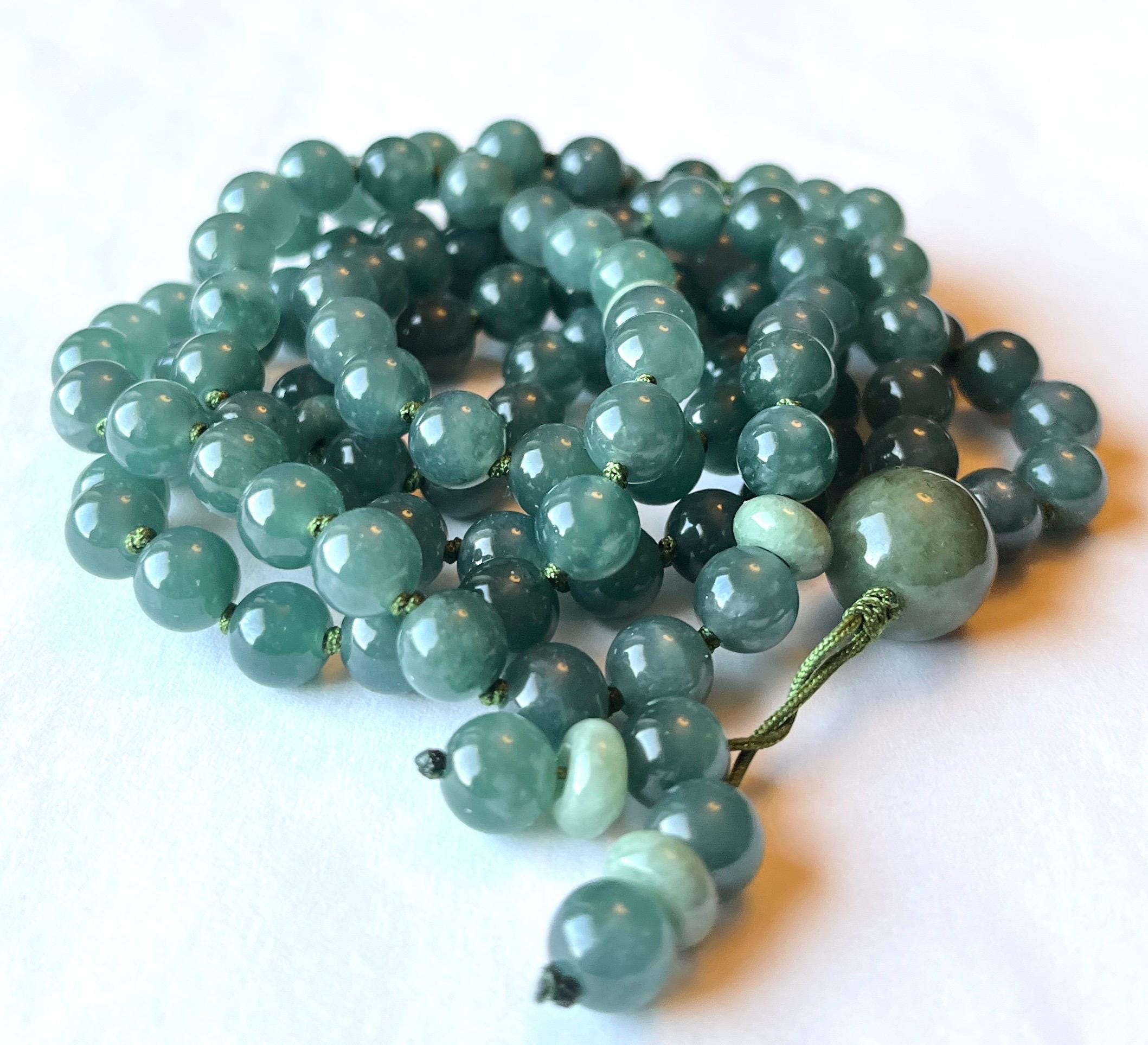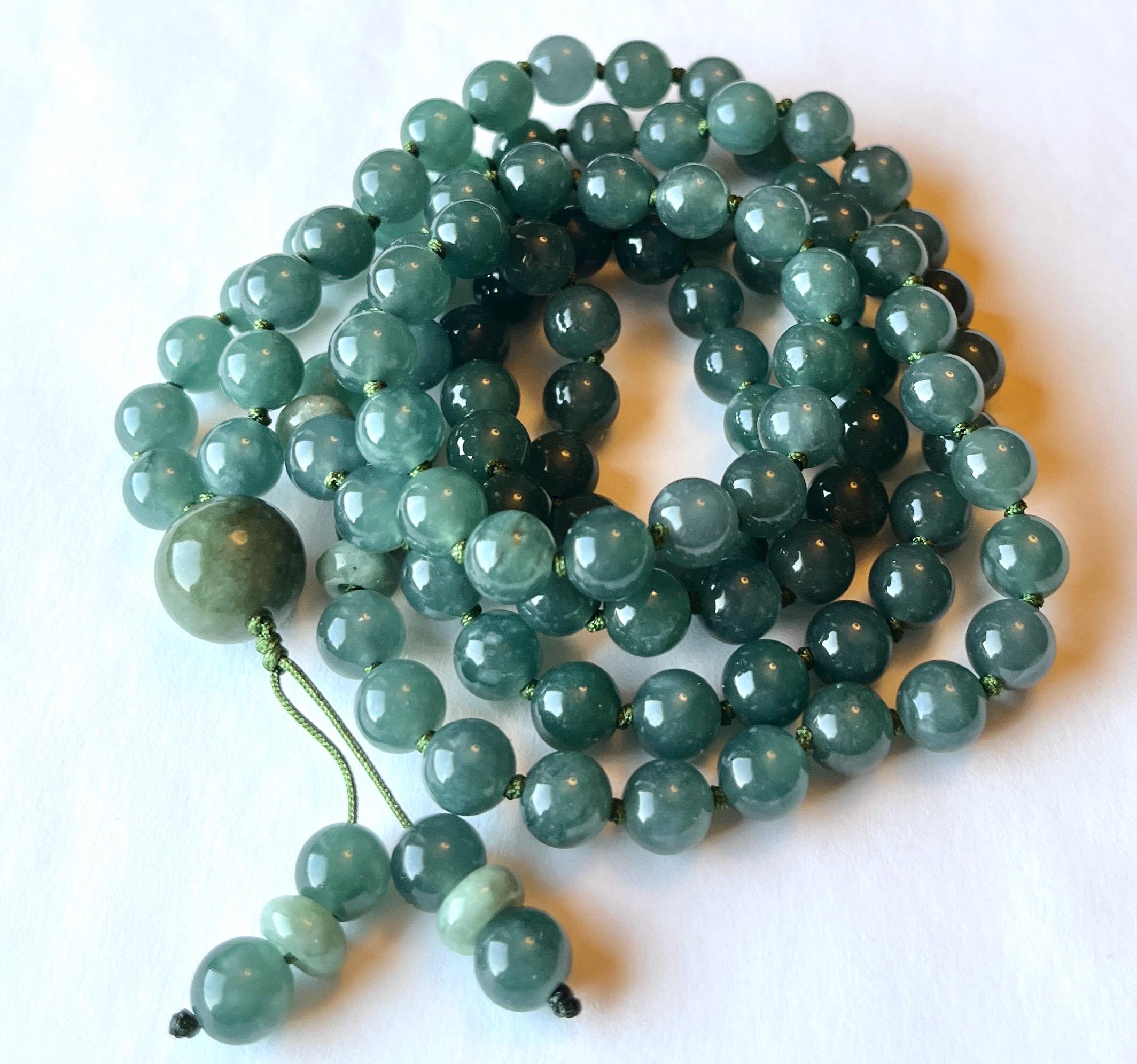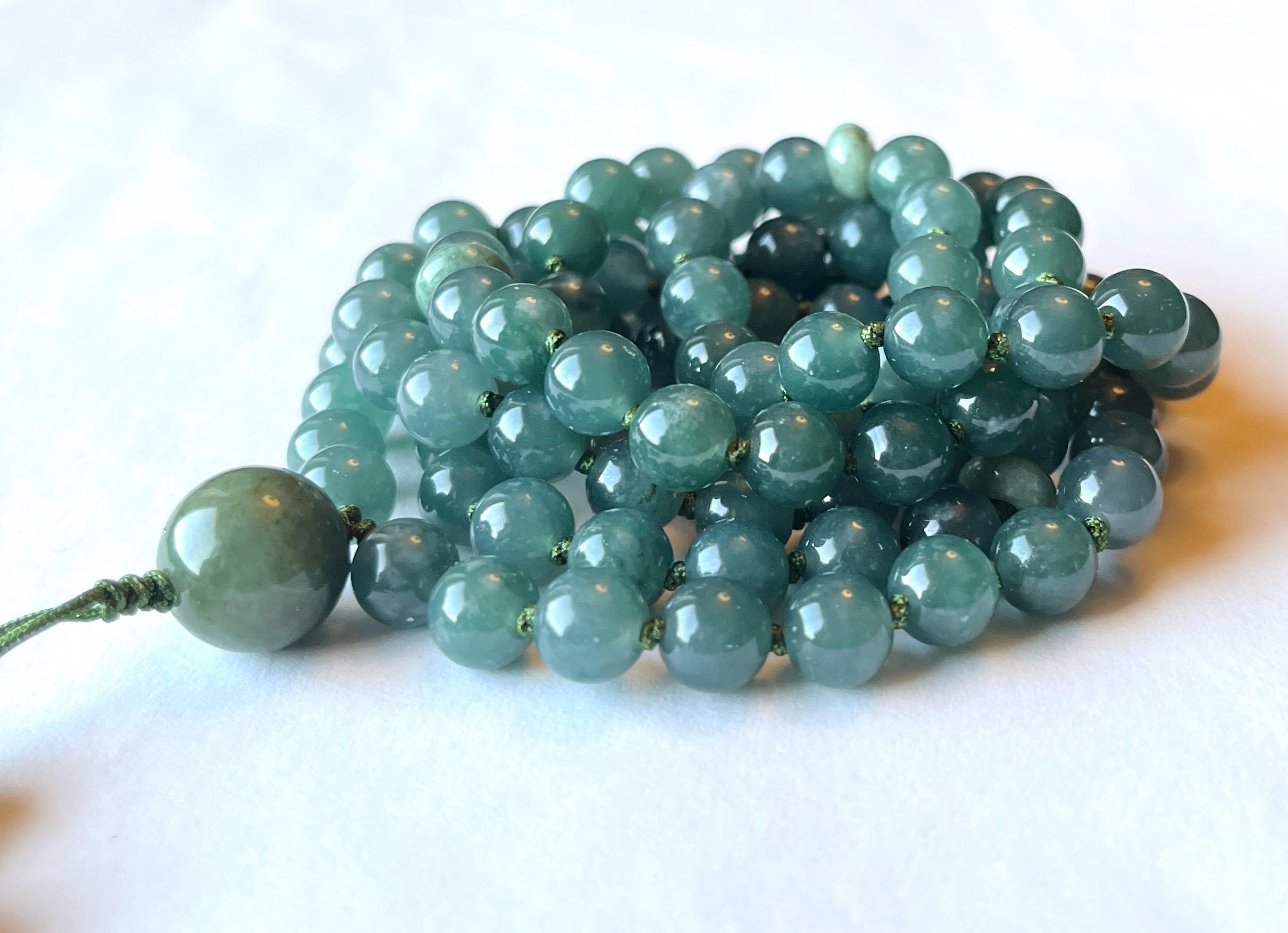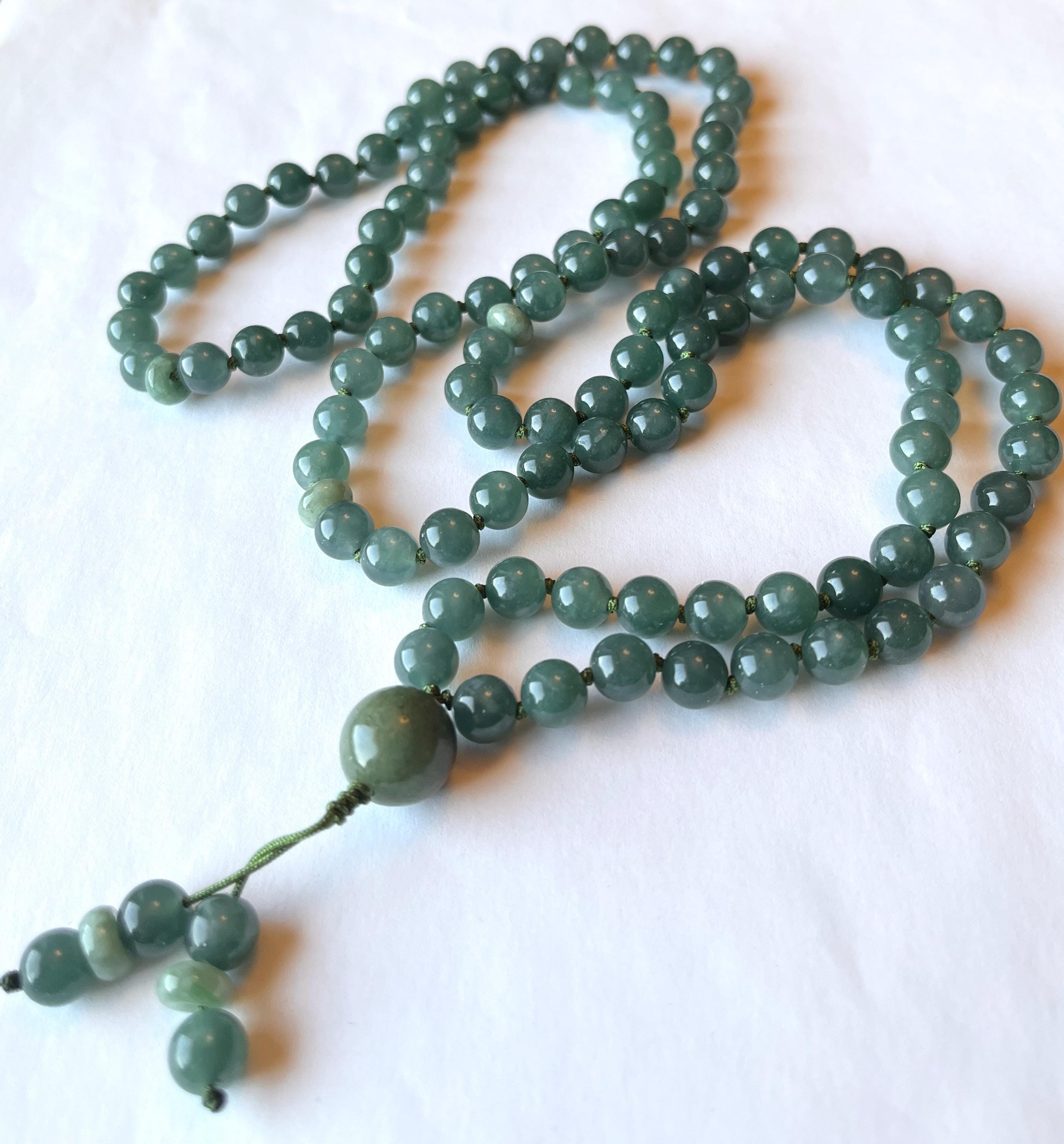 This beautiful 108 mala necklace is made of 7.5mm genuine grade A natural ( untreated ) lake green Jadeite, natural untreated Burma Jadeite maker beads and 13mm natural Burma green Jadeite guru, hand knotted between each beads with nylon beading cord, finished with beaded tassel/handmade raylon silk tassel.