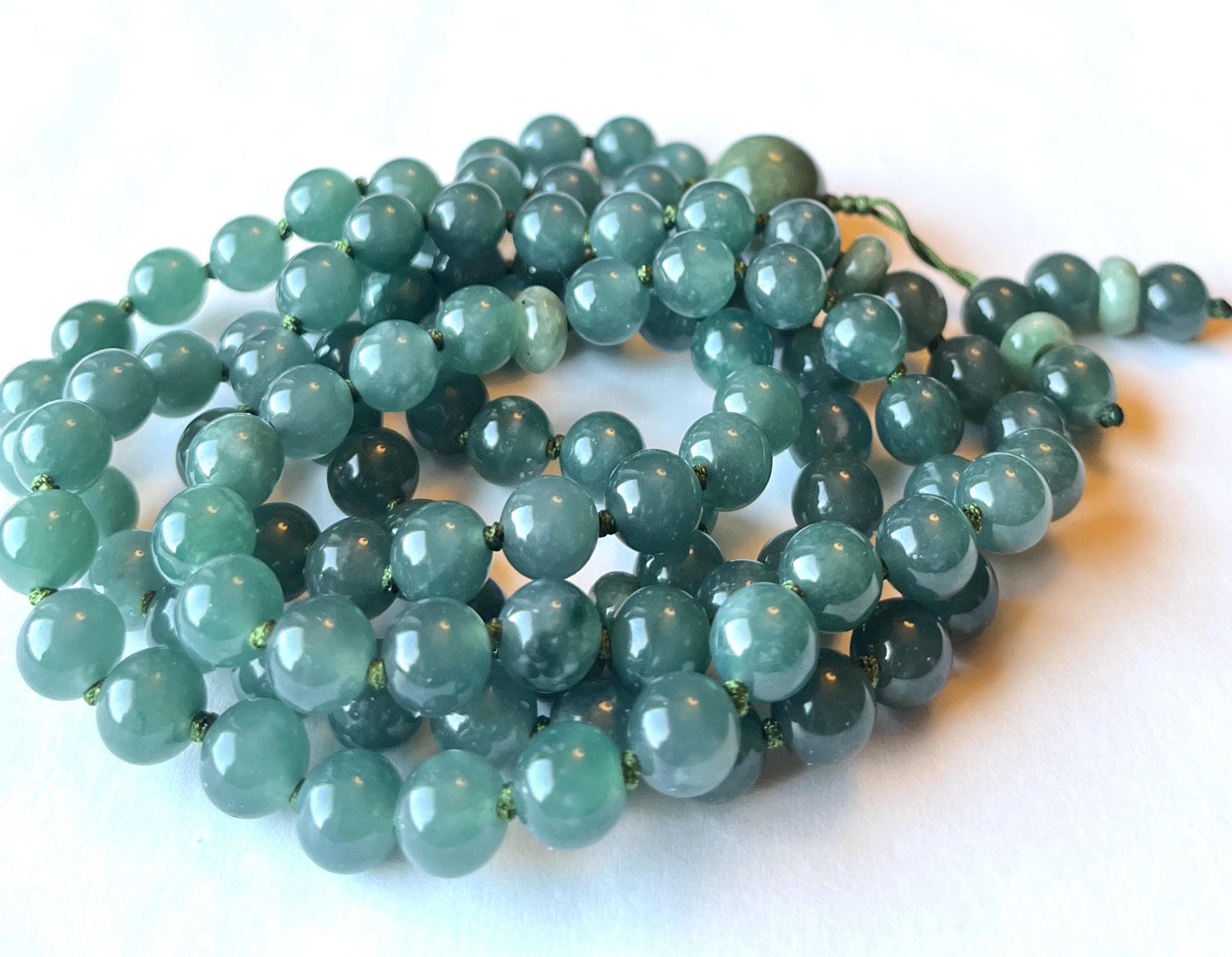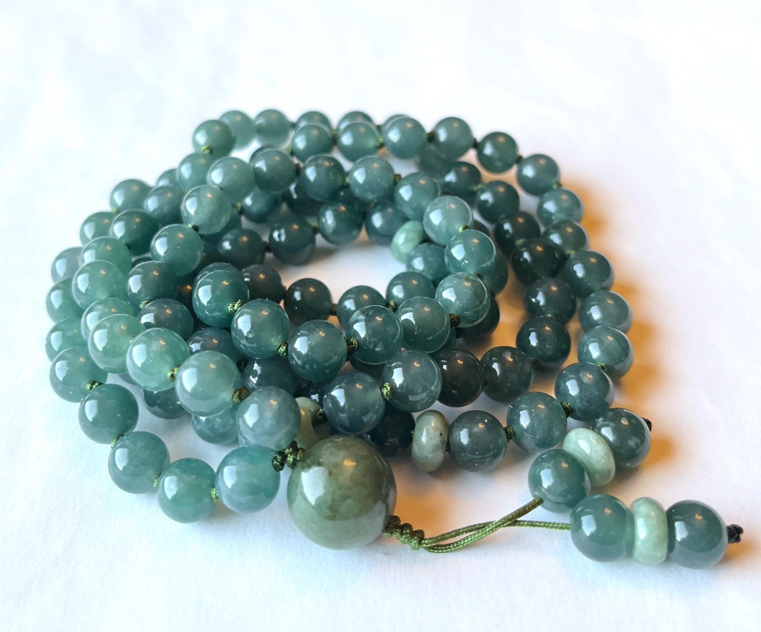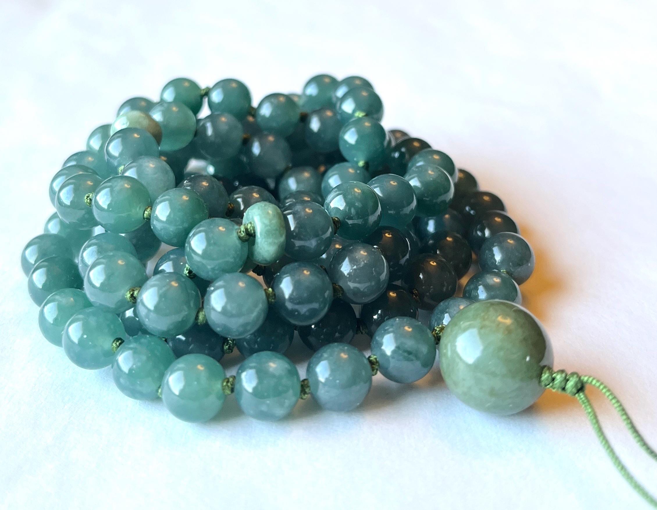 These gorgeous mala beads are made using premium quality shiny Jadeite, in shades of lake green, from Burma. These stones are natural and not dyed.